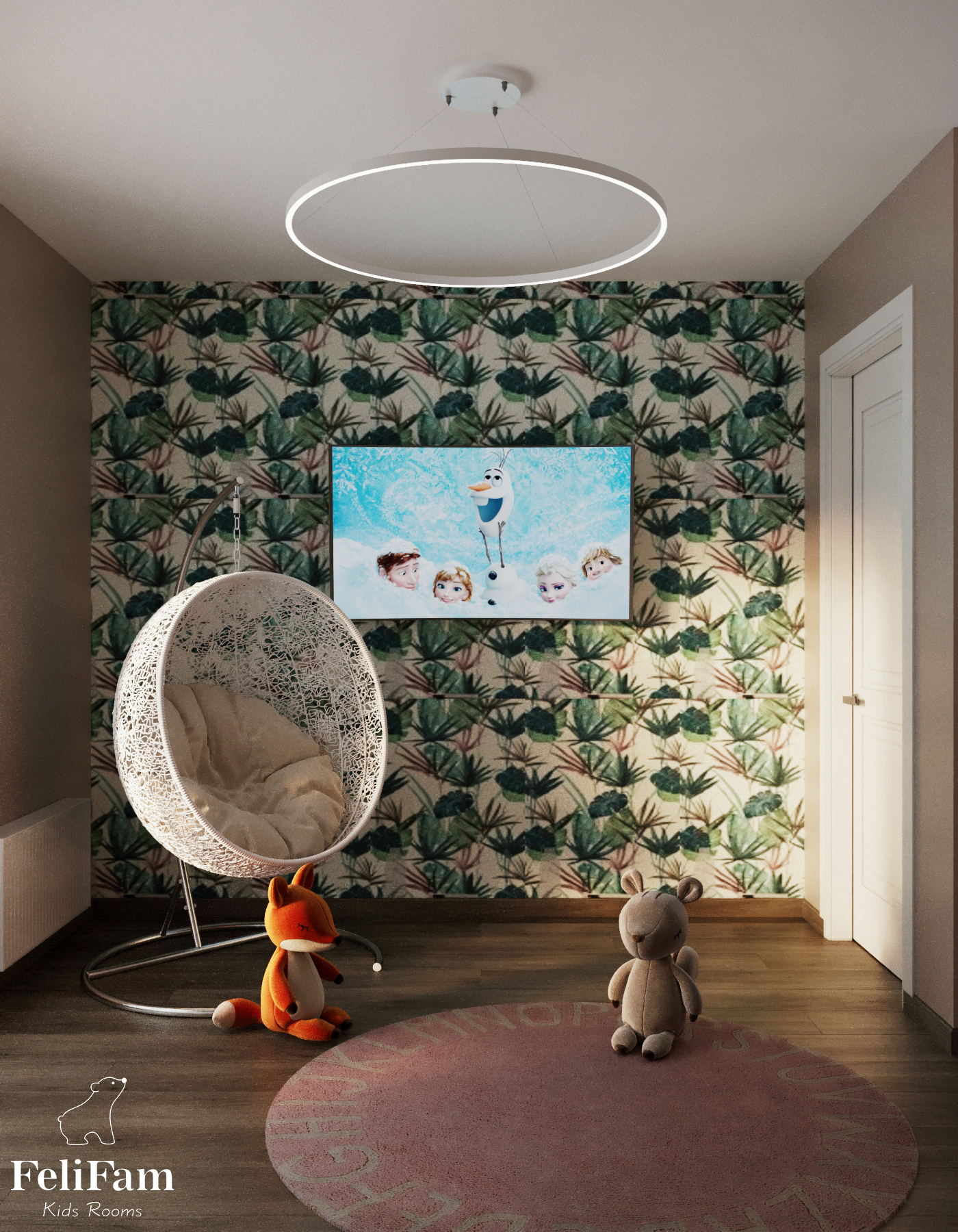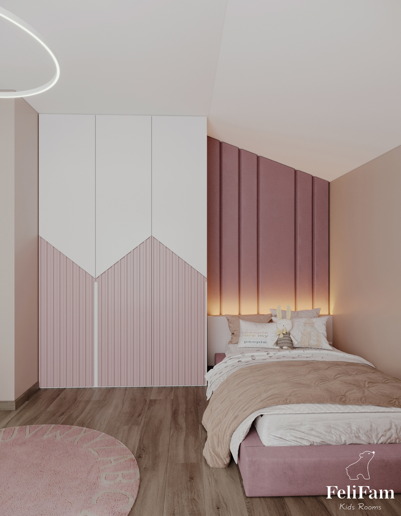 Questa stanza ha tutto quello che serve a una bambina moderna: un’area di lavoro con ripostiglio, un armadio spazioso, un letto accogliente, un tappeto morbido, una sedia comoda ed elegante per guardare la TV e un design elegante in colori chiari!