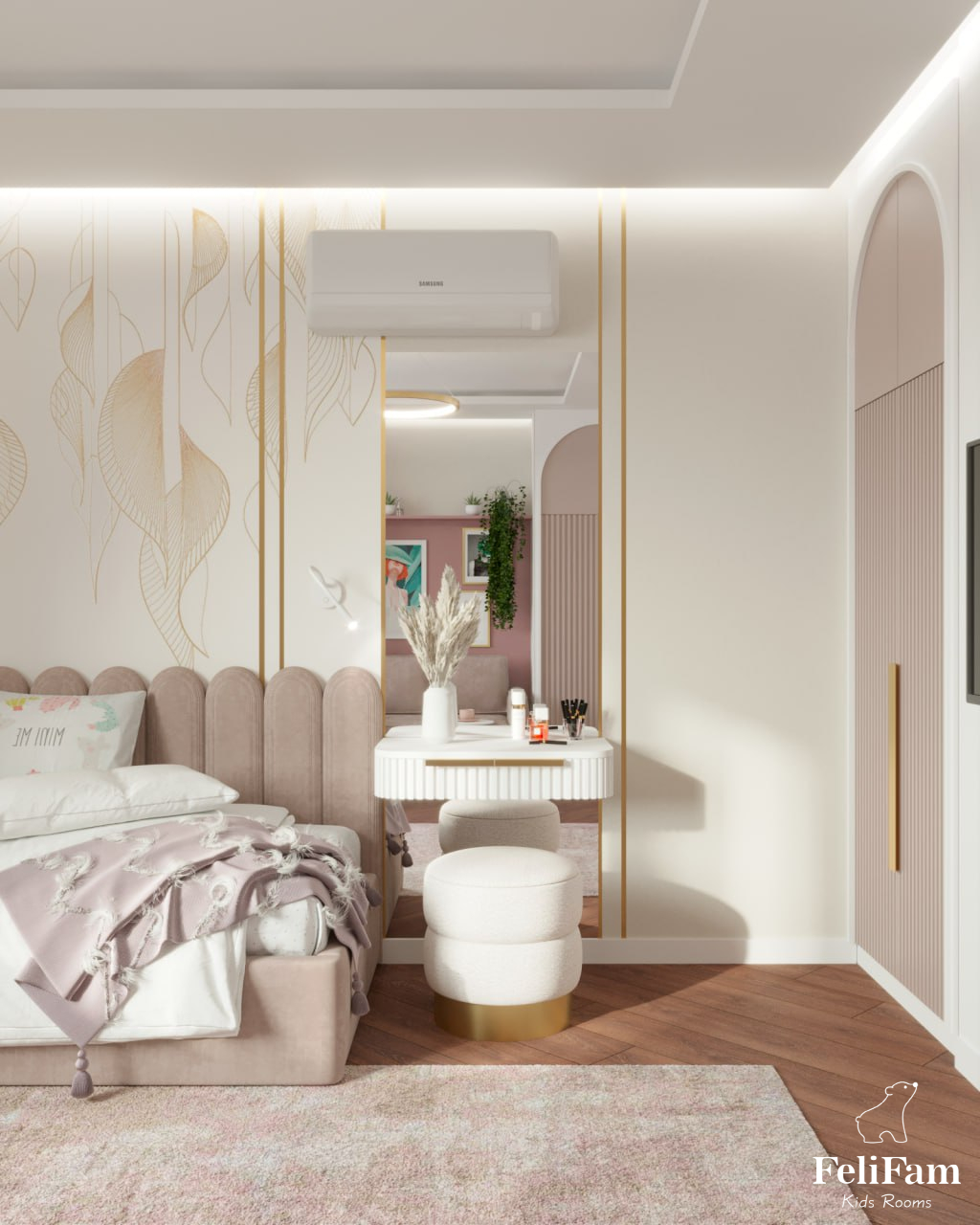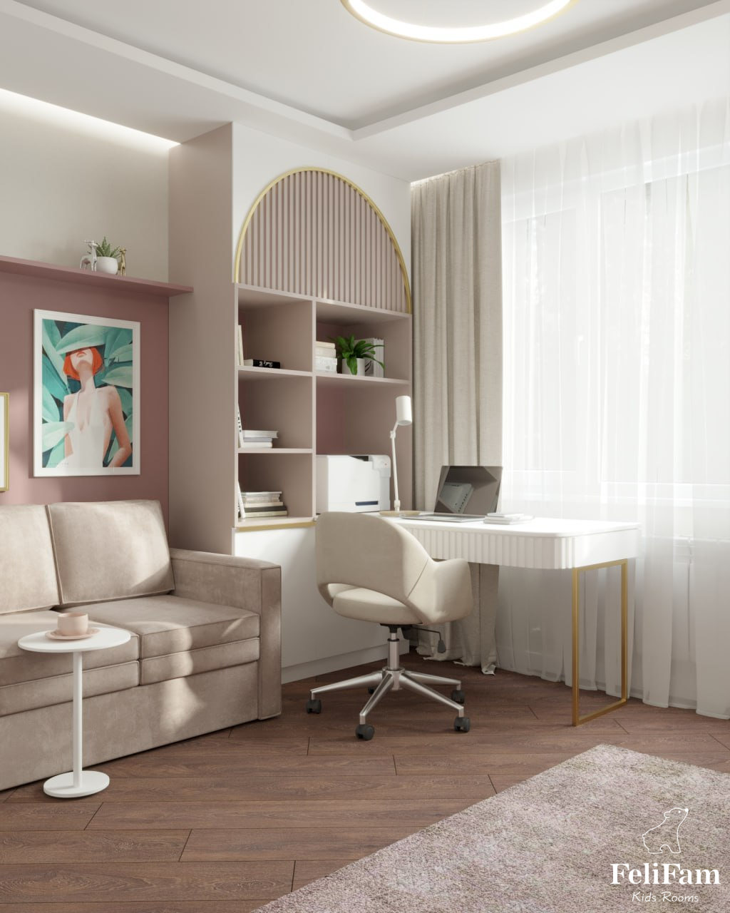 Camera luminosa ed elegante per una bambina di 10 anni. La stanza ha tutto il necessario: una toeletta per una giovane donna e un letto supplementare sotto forma di divano pieghevole. Un letto accogliente e un’area di lavoro funzionale. E, naturalmente, armadi per riporre i vestiti!