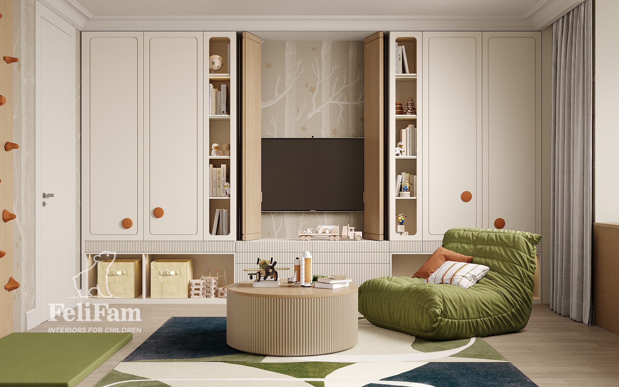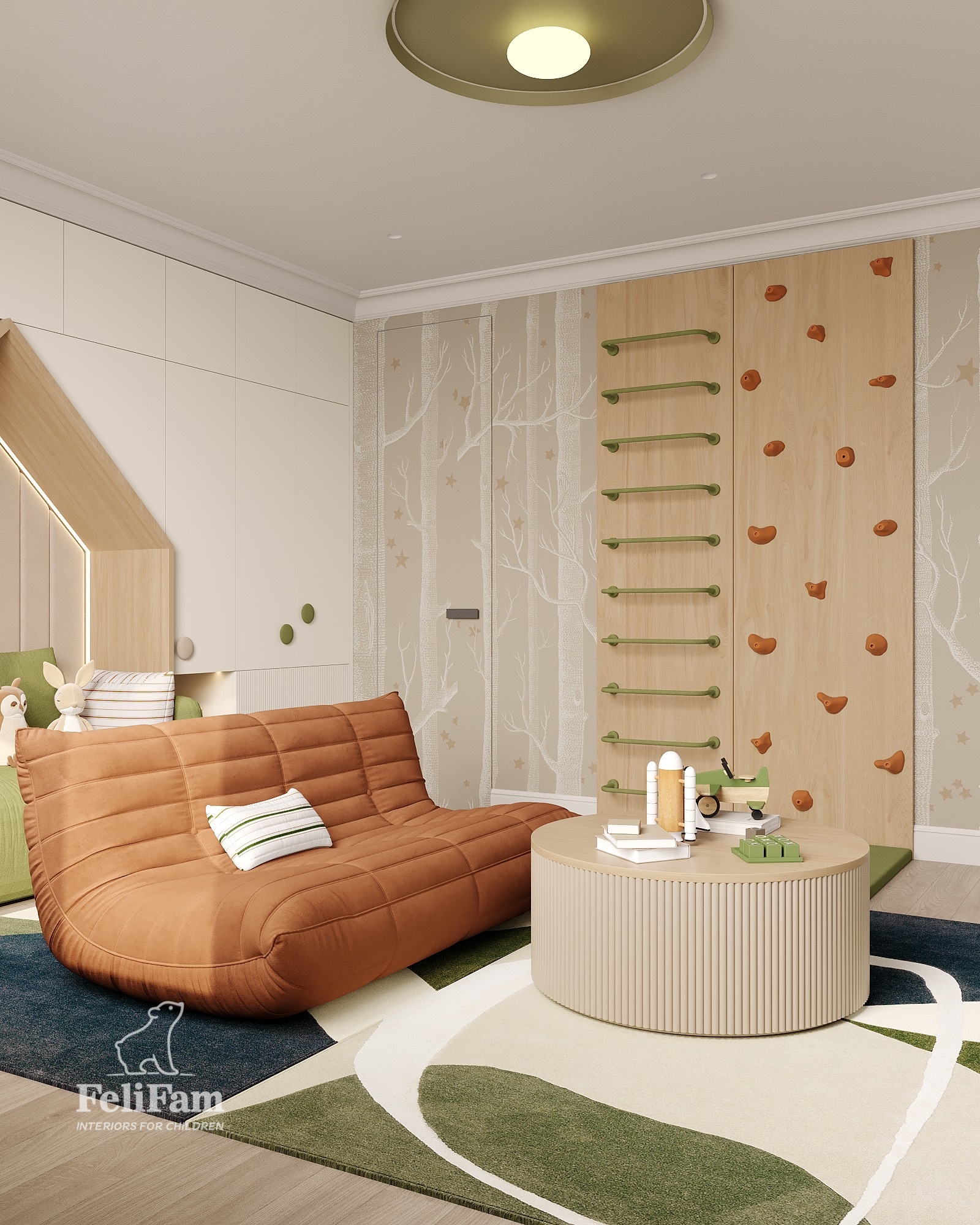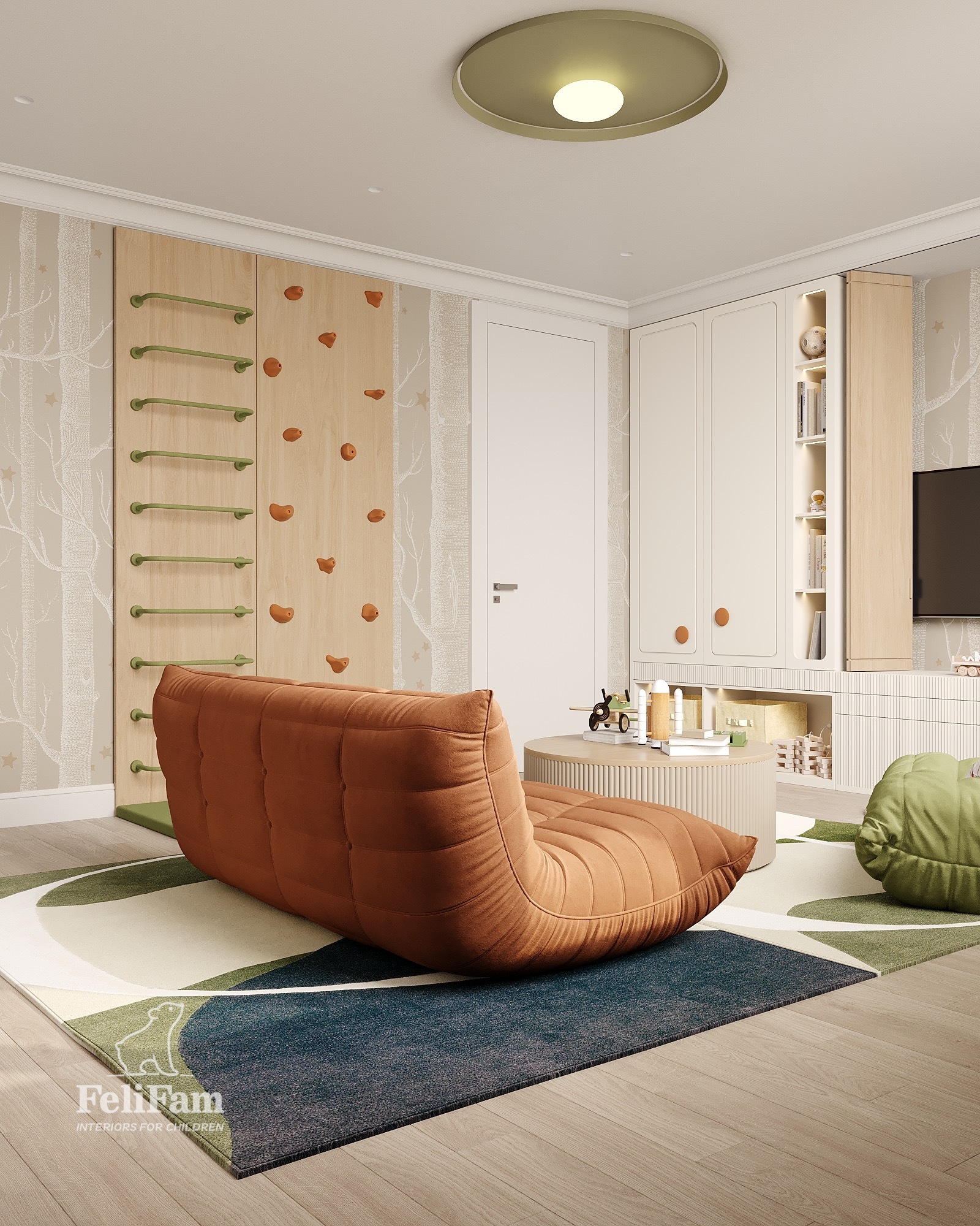 Il progetto include sedute morbide nelle tonalità kaki e terracotta, un grande tavolo rotondo per le attività di gruppo, una parete da arrampicata e una scala per l’attività fisica, oltre a soluzioni di contenimento integrate. Per la sicurezza, la TV è nascosta all’interno dell’arredo, consentendo un utilizzo dello spazio in modo attivo senza rischi.