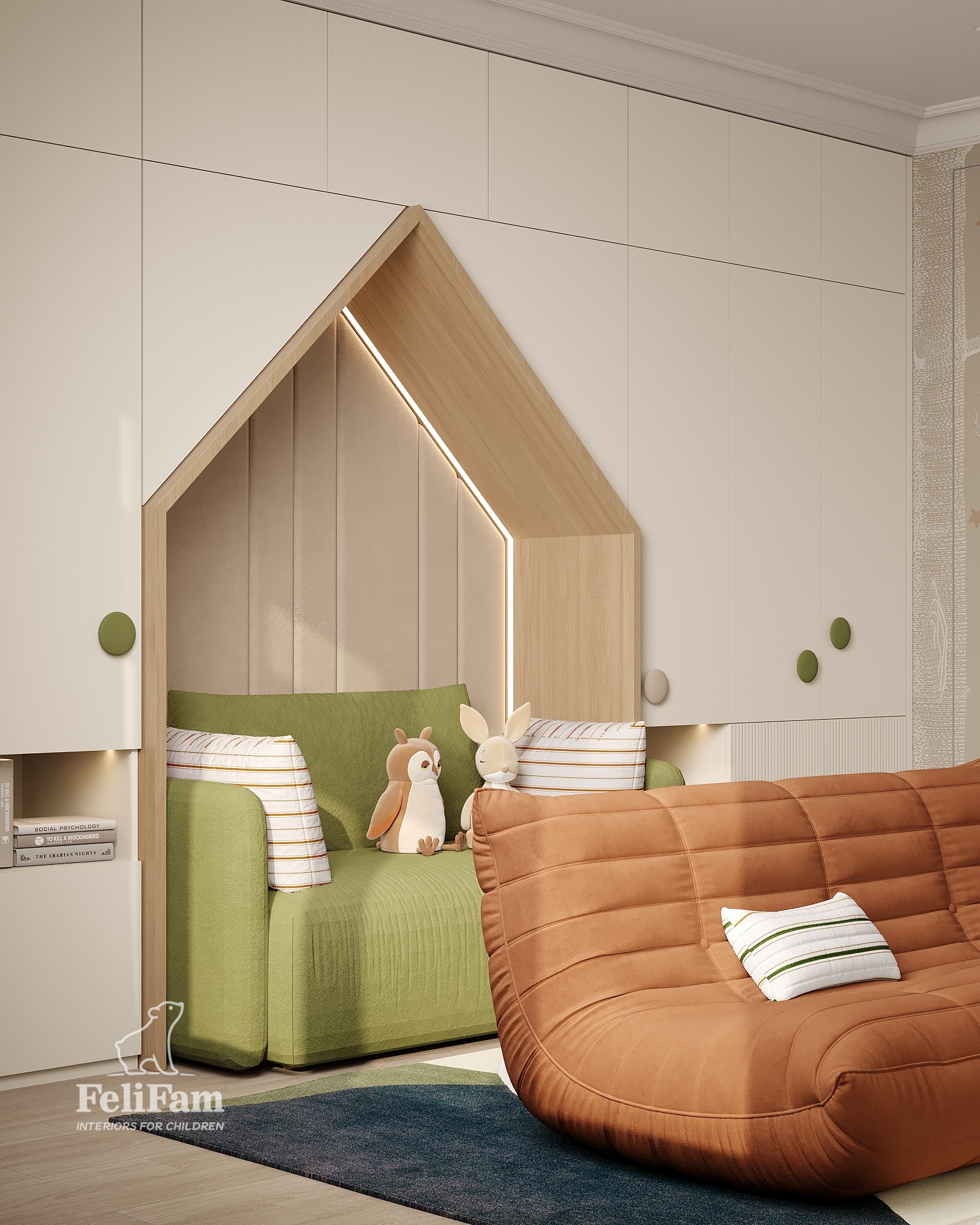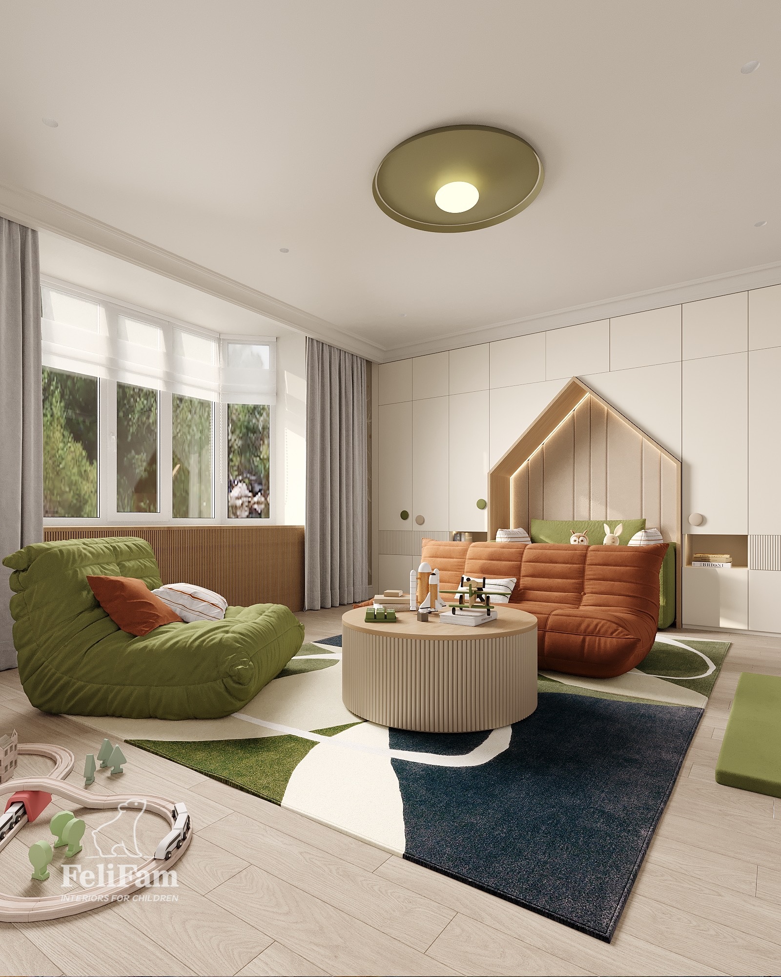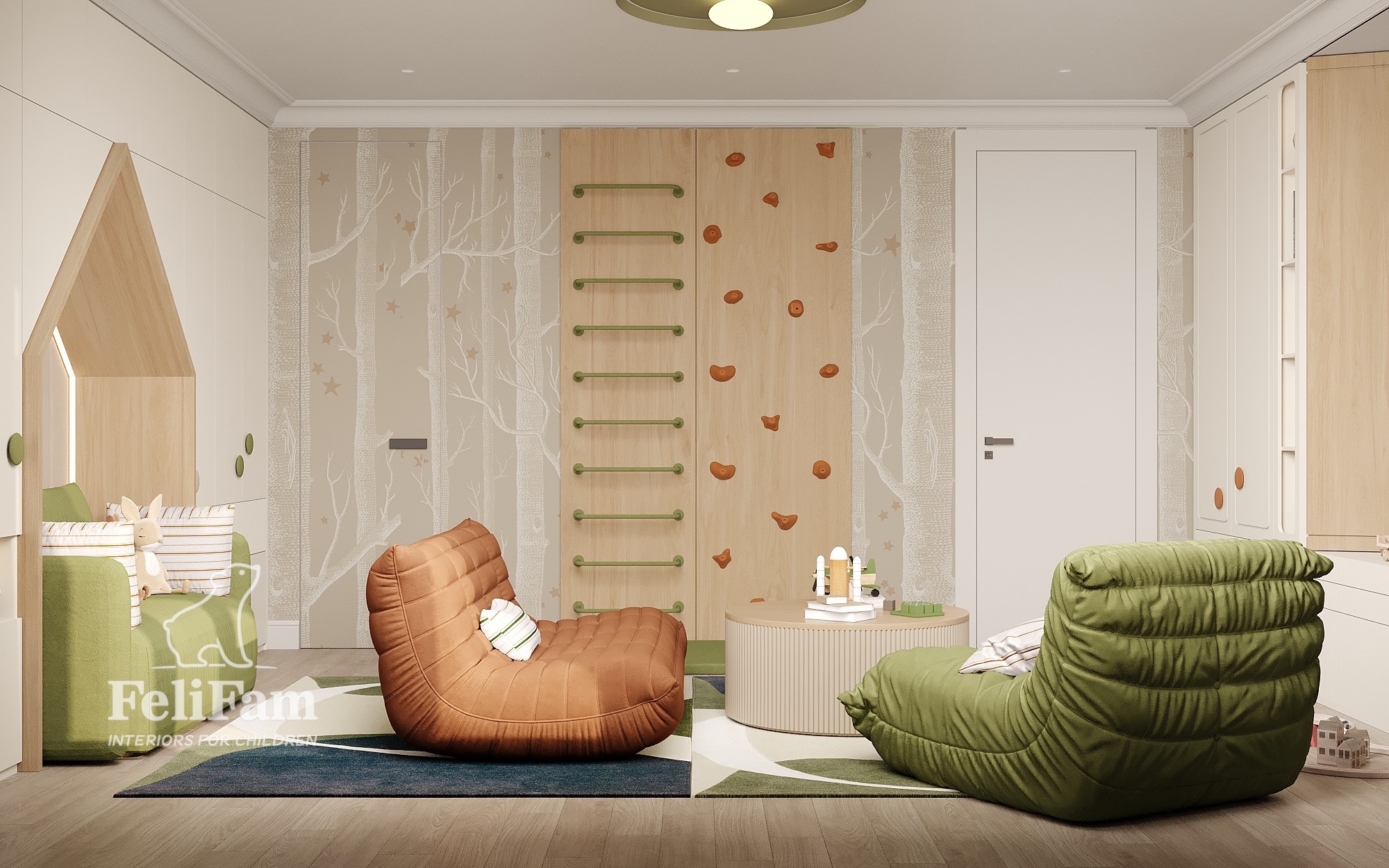Il progetto include sedute morbide nelle tonalità kaki e terracotta, un grande tavolo rotondo per le attività di gruppo, una parete da arrampicata e una scala per l’attività fisica, oltre a soluzioni di contenimento integrate. Per la sicurezza, la TV è nascosta all’interno dell’arredo, consentendo un utilizzo dello spazio in modo attivo senza rischi.