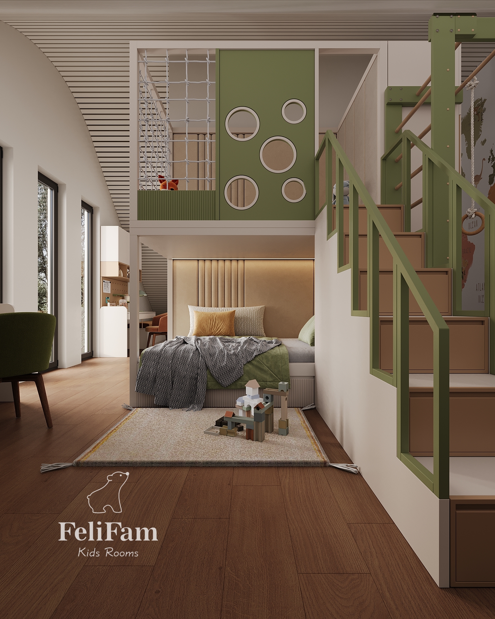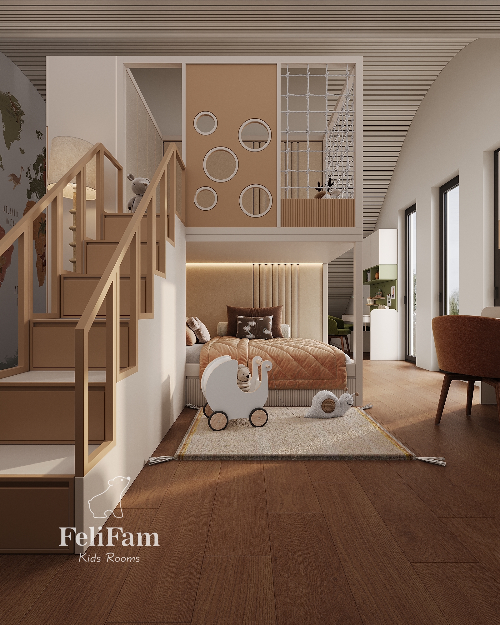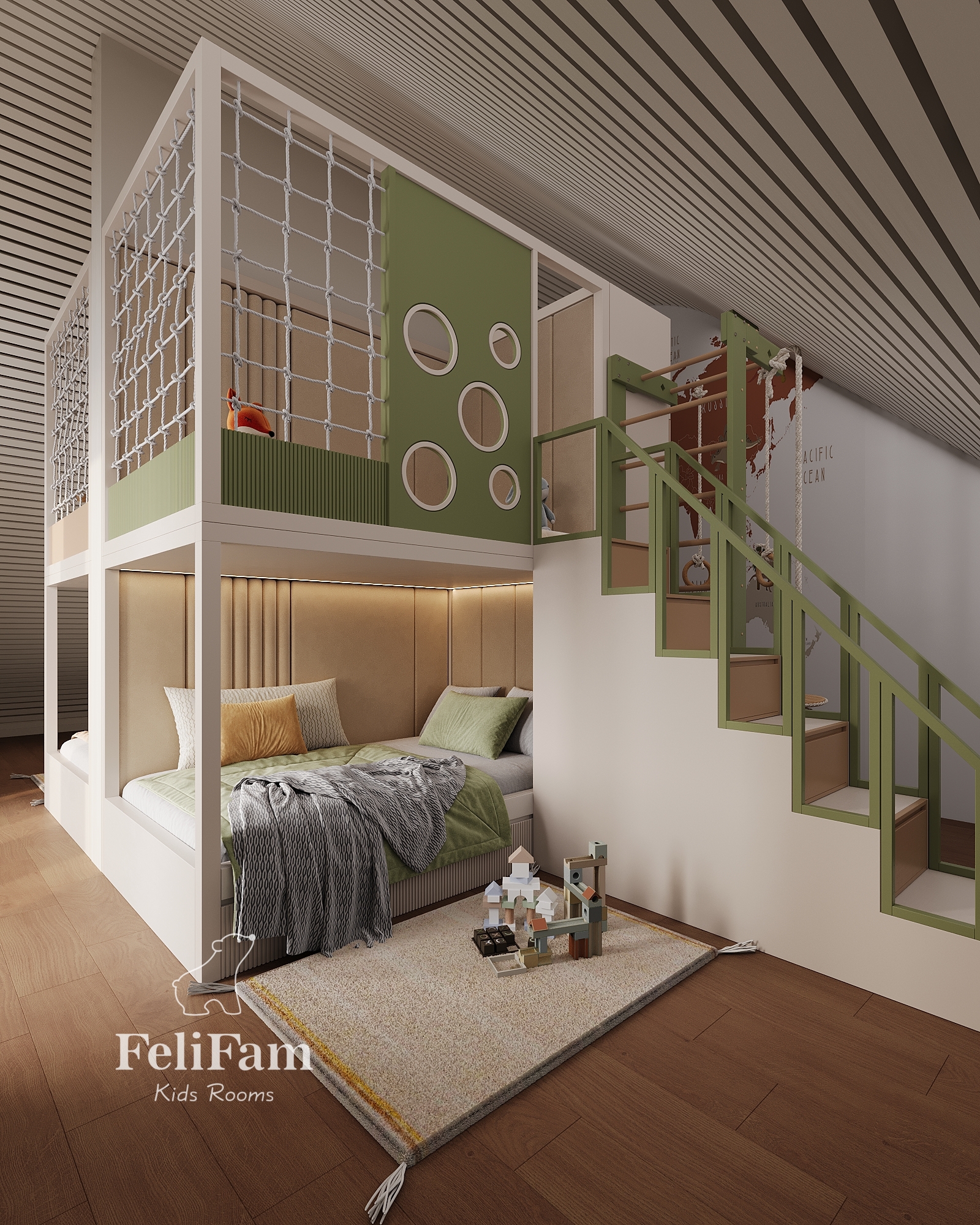 I designer hanno proposto una soluzione unica: una struttura a castello bifacciale che divide la stanza in due aree equivalenti. Su entrambi i lati sono presenti moduli identici: letto in basso e zona giochi in alto, garantendo a ciascun bambino un’area privata per riposo, gioco e sviluppo.