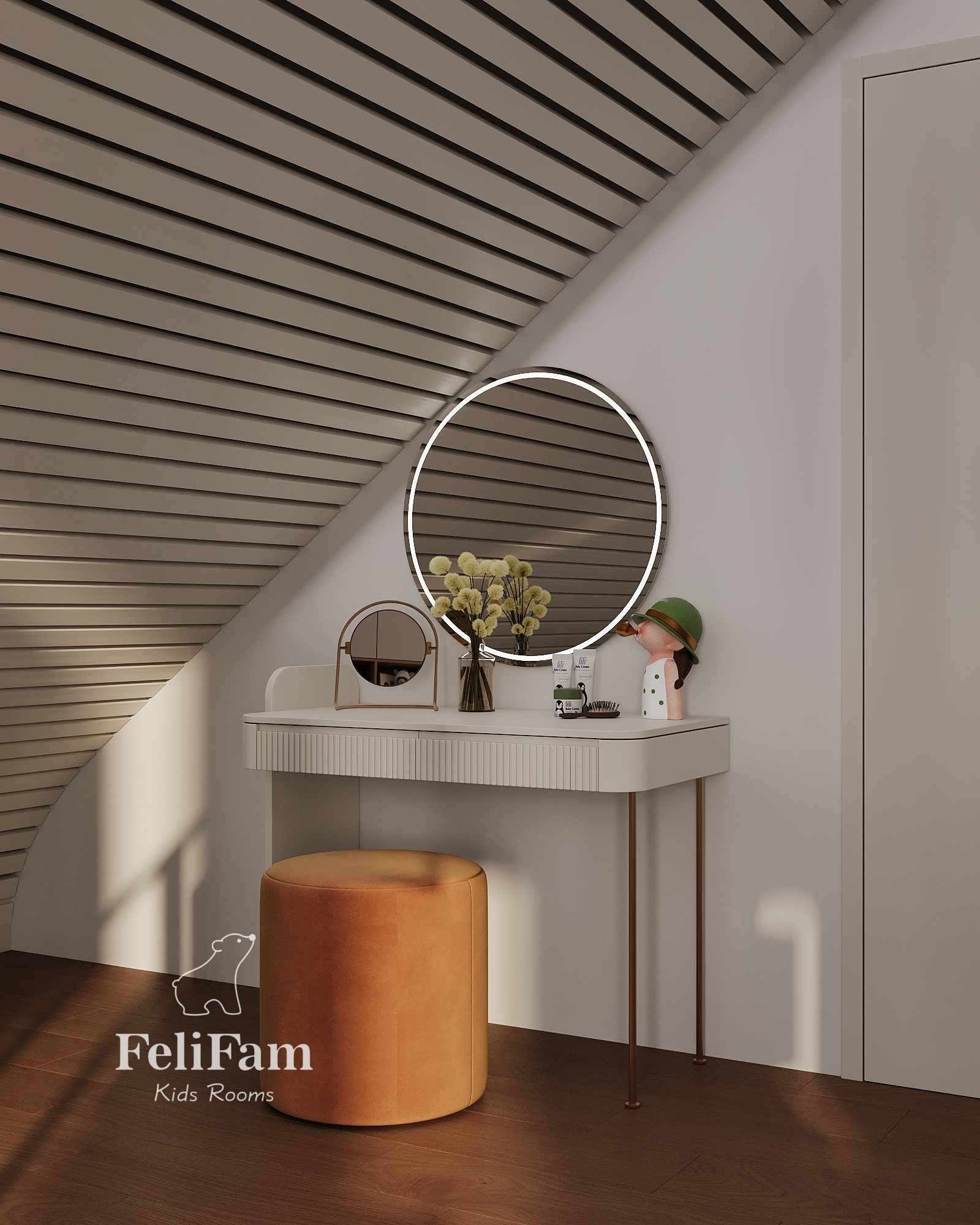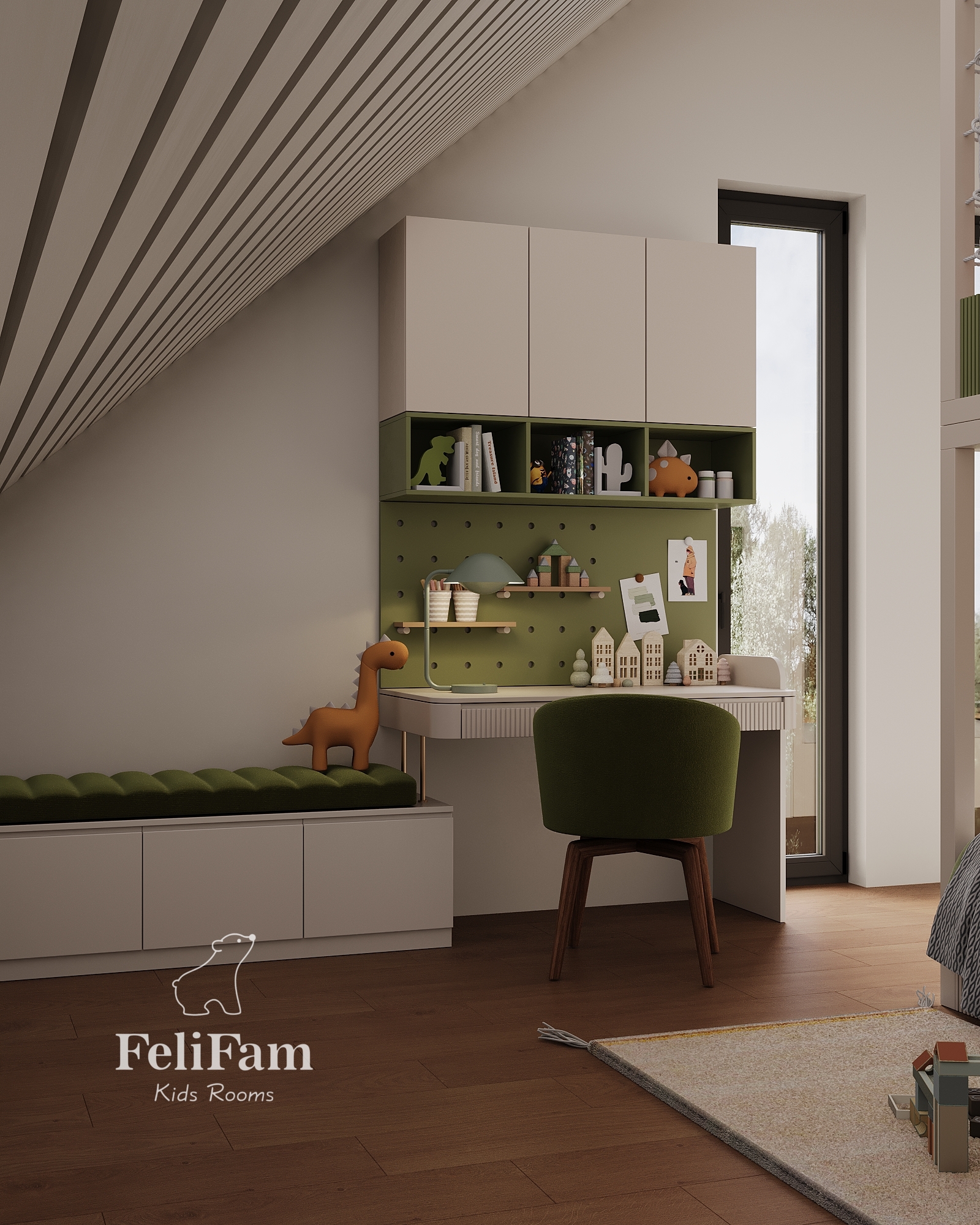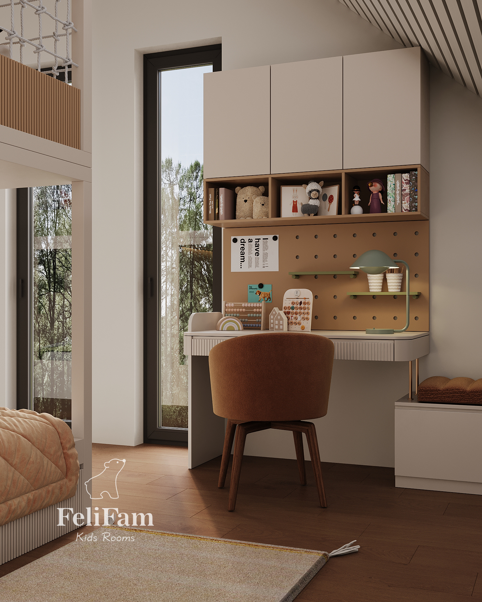 La cameretta include anche due zone studio identiche e un’illuminazione studiata nel dettaglio. Il design è moderno e pensato per accompagnare la crescita dei bambini.