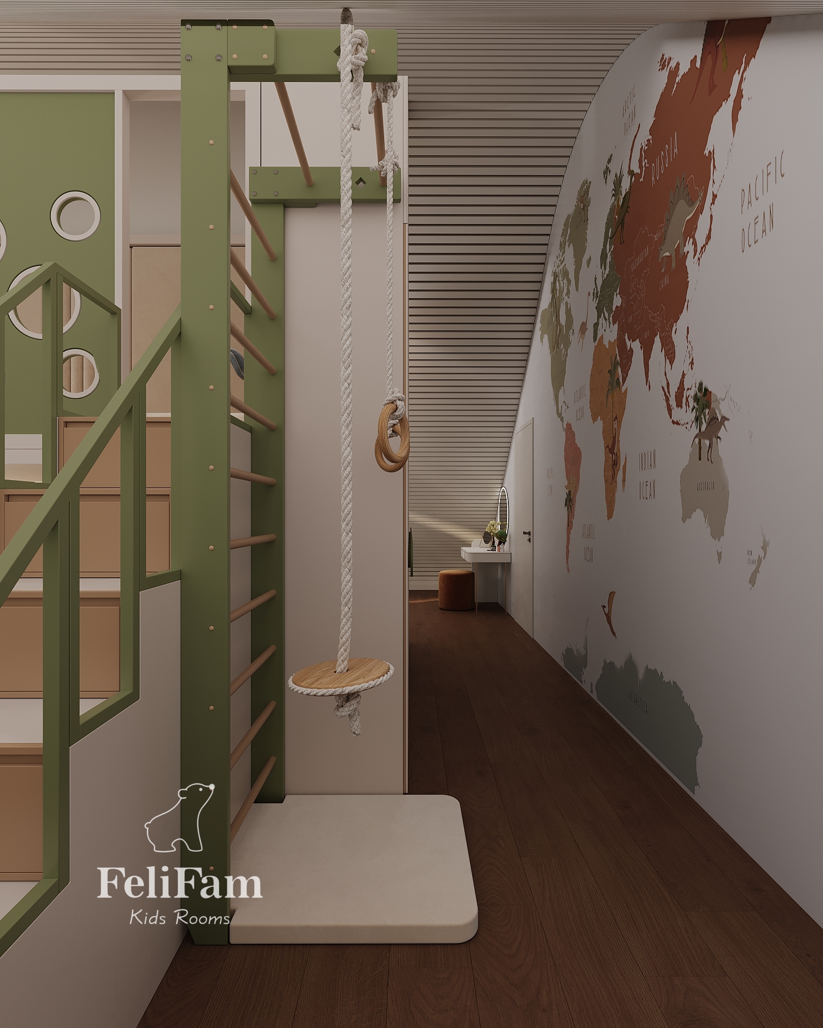 In un ampio spazio di 53 m² è stato creato un ambiente bilanciato per due bambini, dove ciascuno ha il proprio spazio personale.