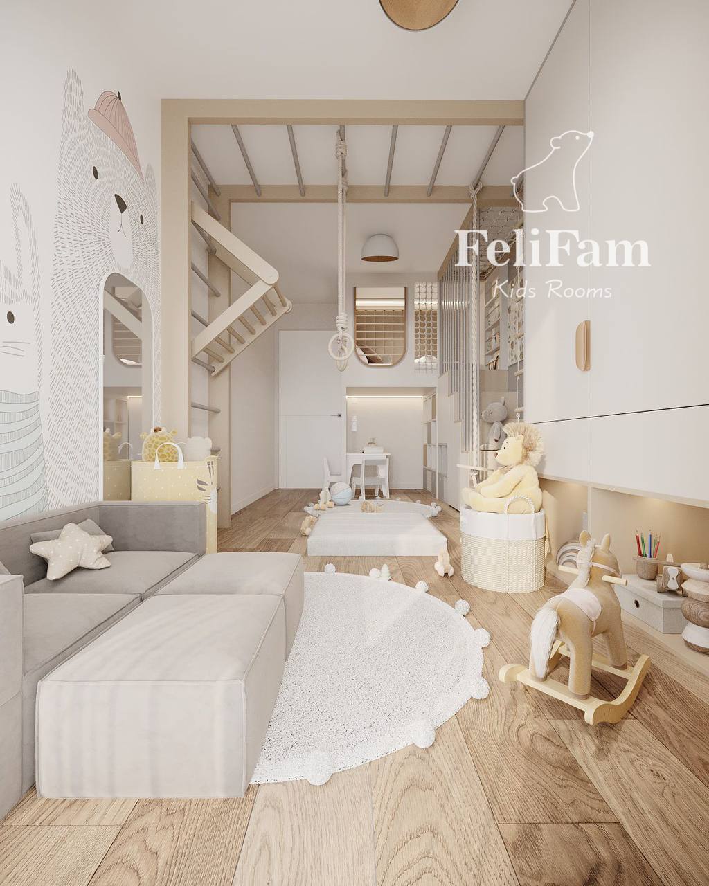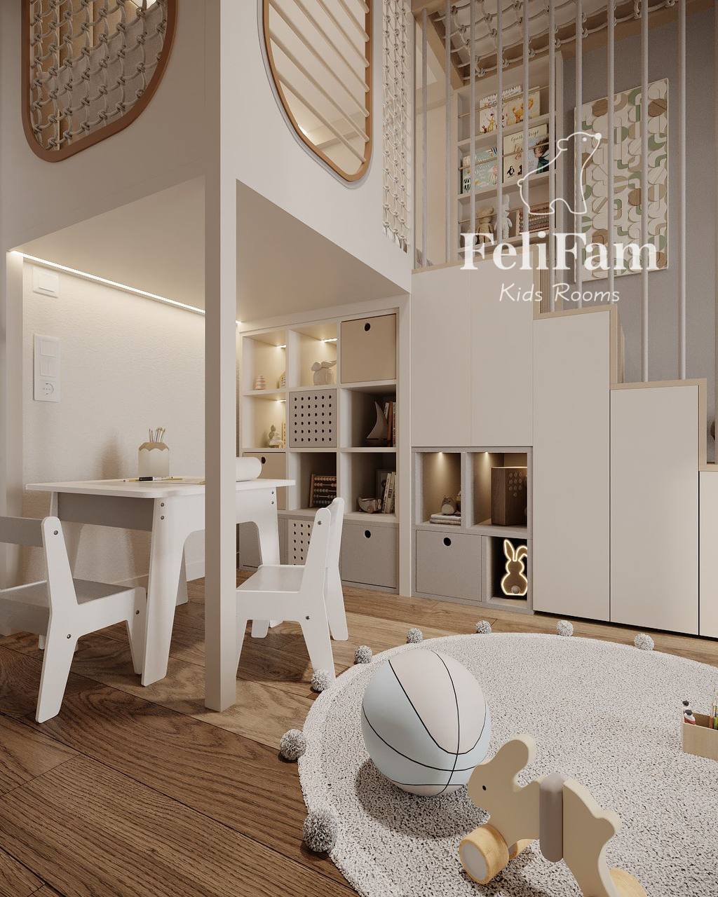 L’interior della cameretta è stato progettato con un forte accento su uno stile di vita attivo e sulla multifunzionalità dello spazio. La zona sportiva è organizzata in modo particolarmente intelligente: la spalliera/struttura per l’arrampicata corre lungo il perimetro della stanza, permettendo di sfruttare le pareti senza ridurre la superficie utile e creando opportunità per l’attività fisica quotidiana del bambino.