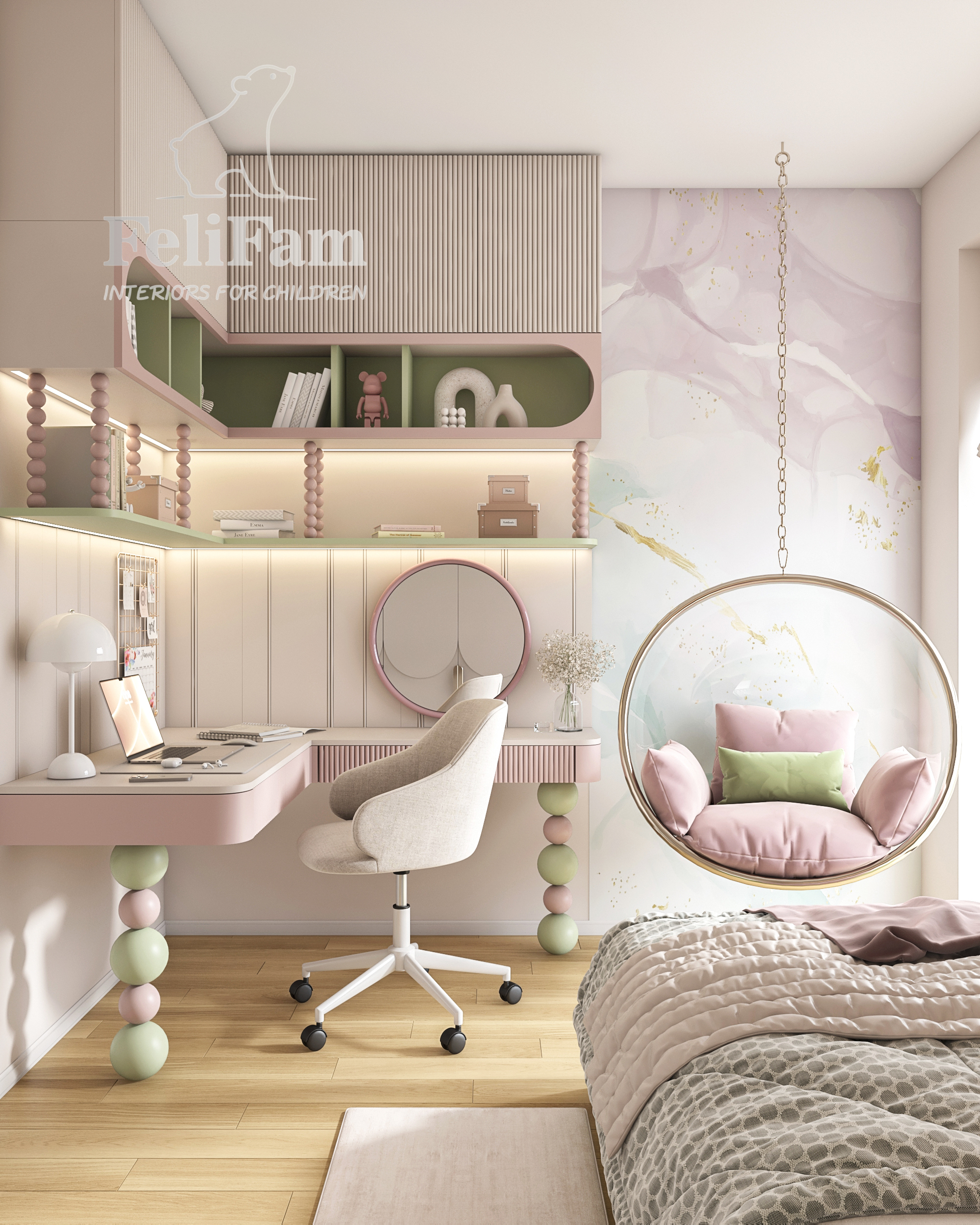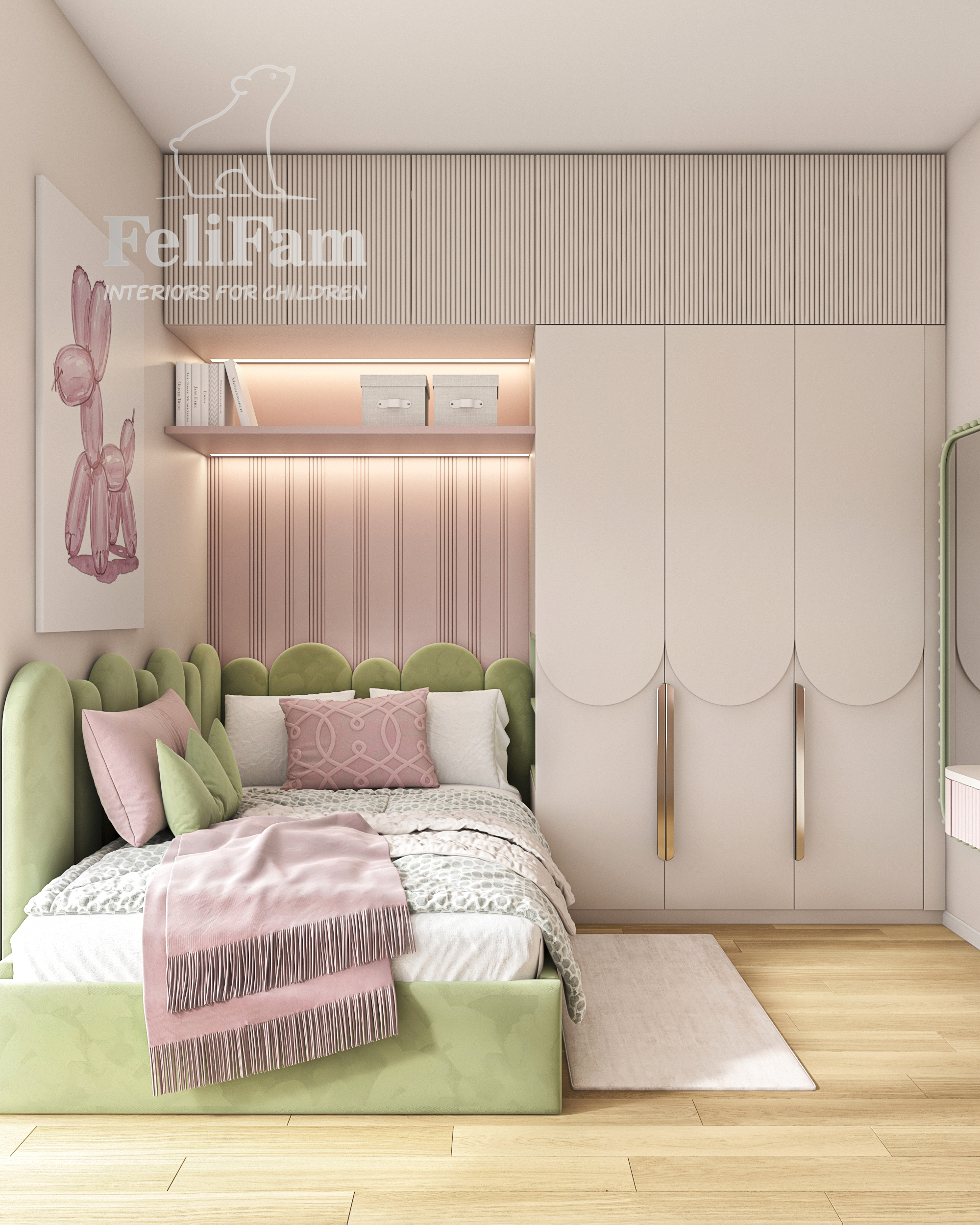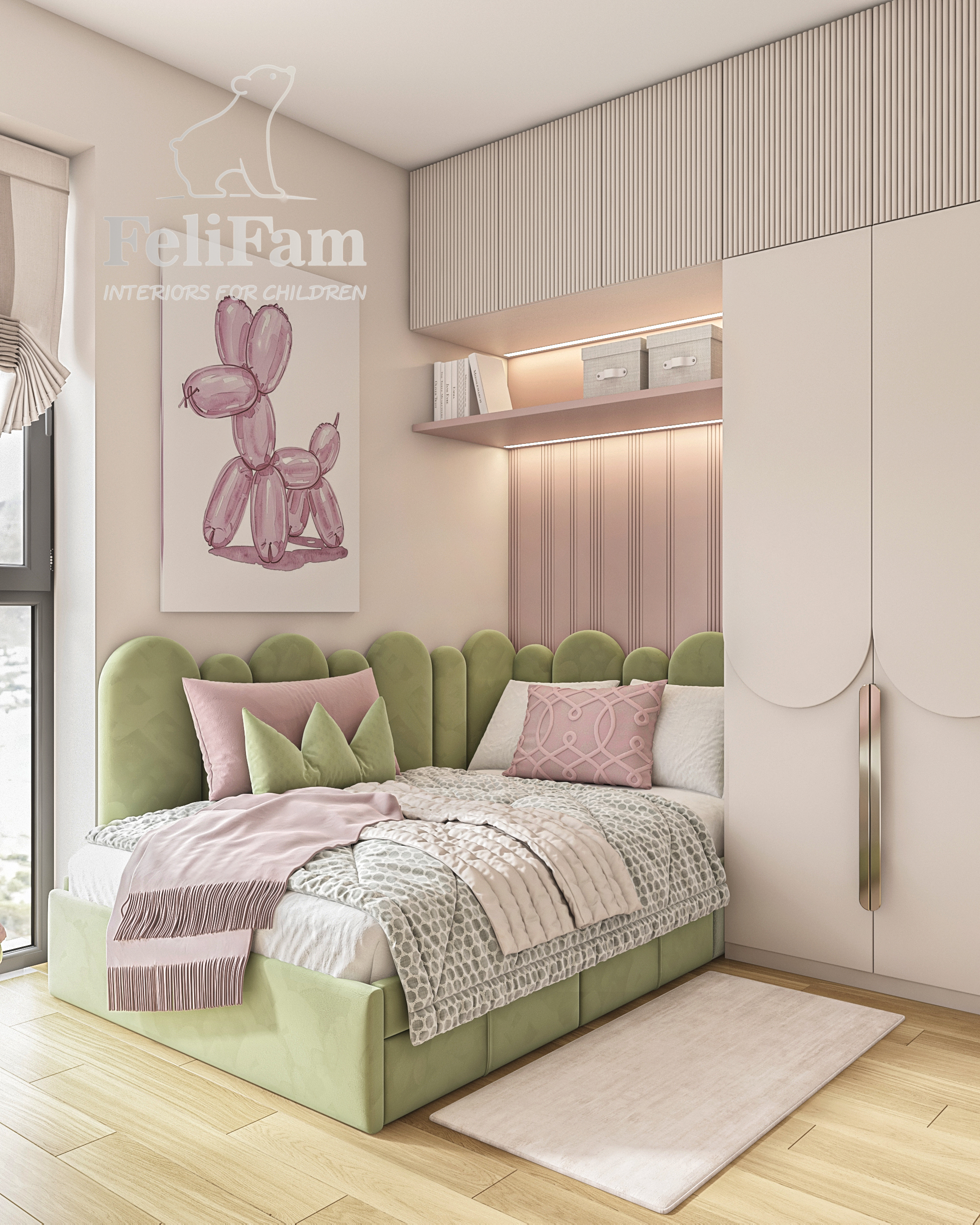 L’interior è realizzato in delicate tonalità pastello con accenti rosa e verdi, che creano un’atmosfera luminosa e piacevole. Le forme arrotondate degli arredi, i pannelli imbottiti e l’illuminazione studiata rendono la stanza moderna, sicura ed emotivamente confortevole.