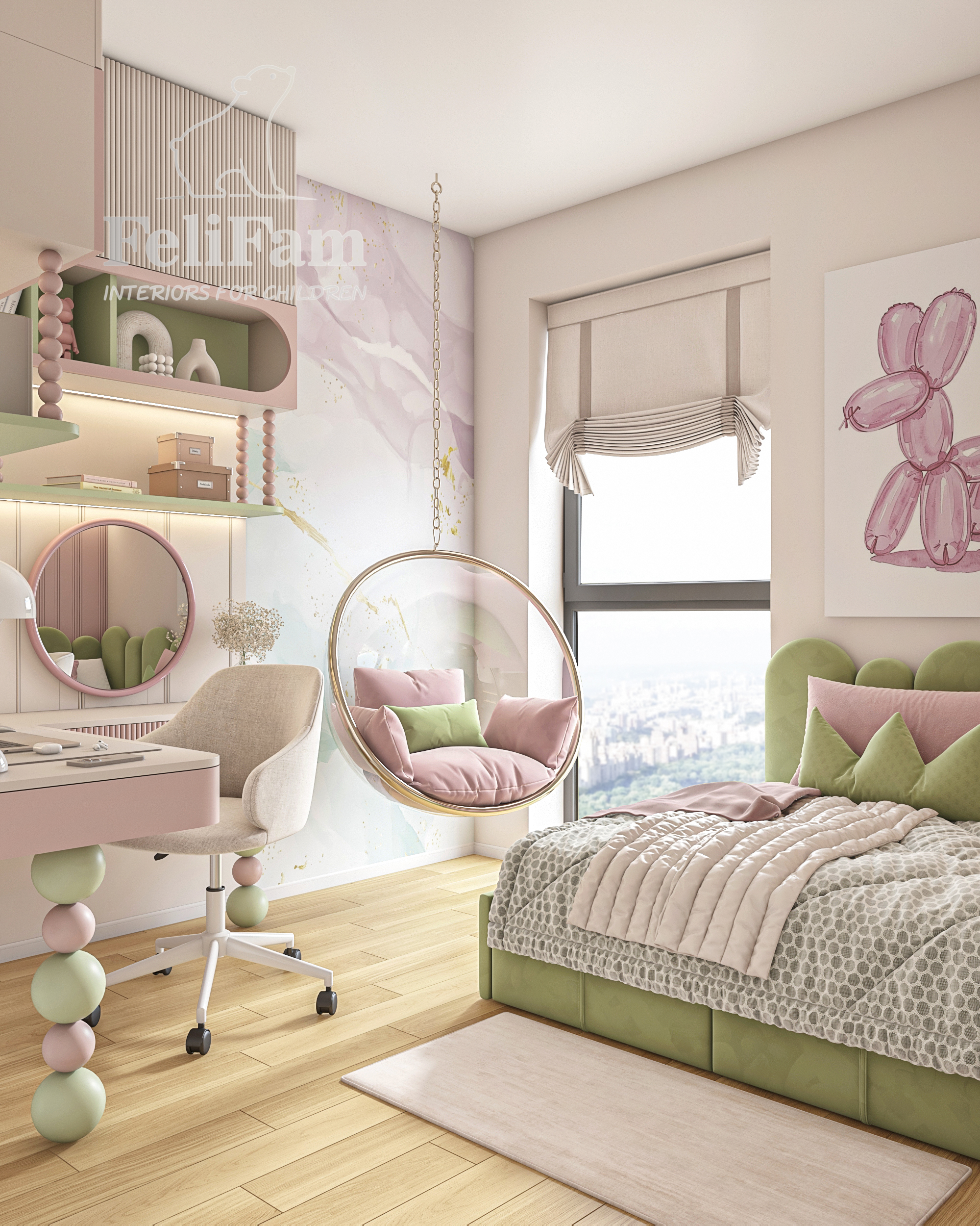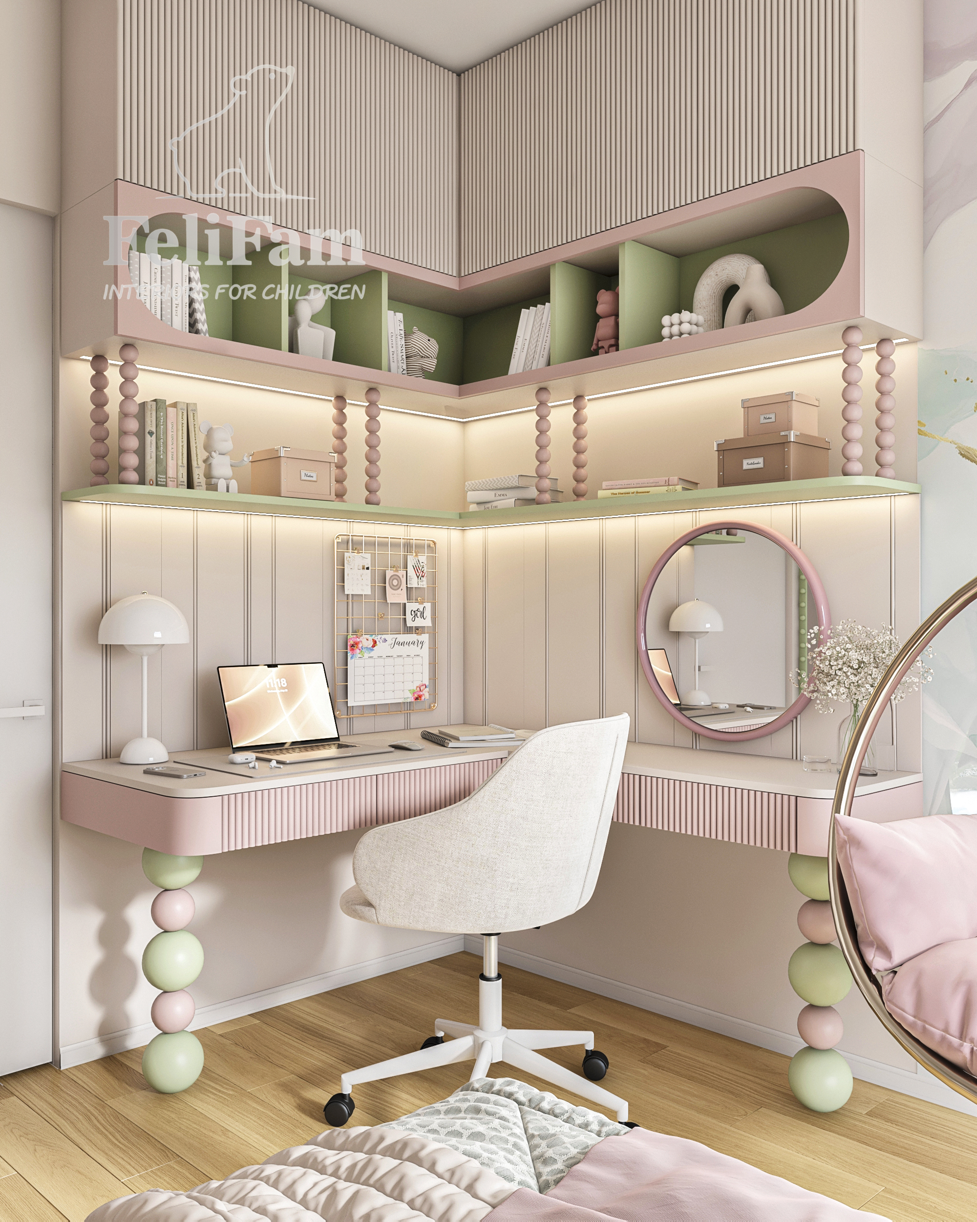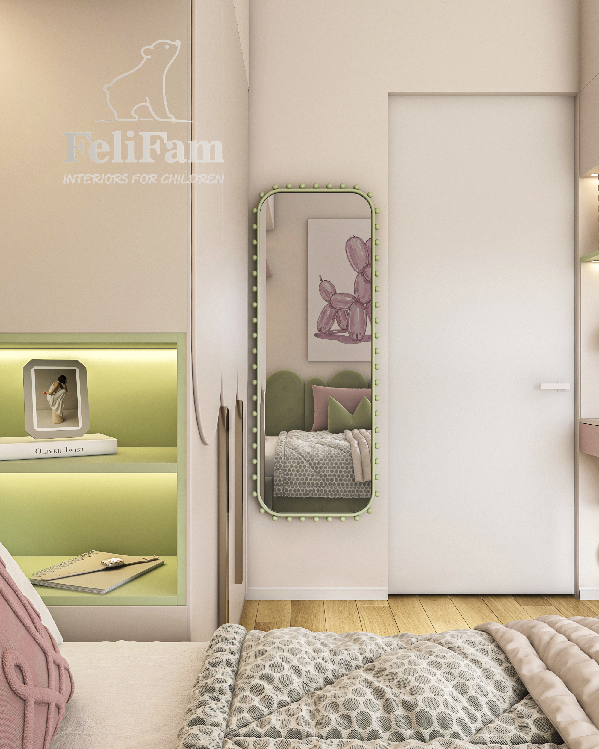 L’interior è realizzato in delicate tonalità pastello con accenti rosa e verdi, che creano un’atmosfera luminosa e piacevole. Le forme arrotondate degli arredi, i pannelli imbottiti e l’illuminazione studiata rendono la stanza moderna, sicura ed emotivamente confortevole.