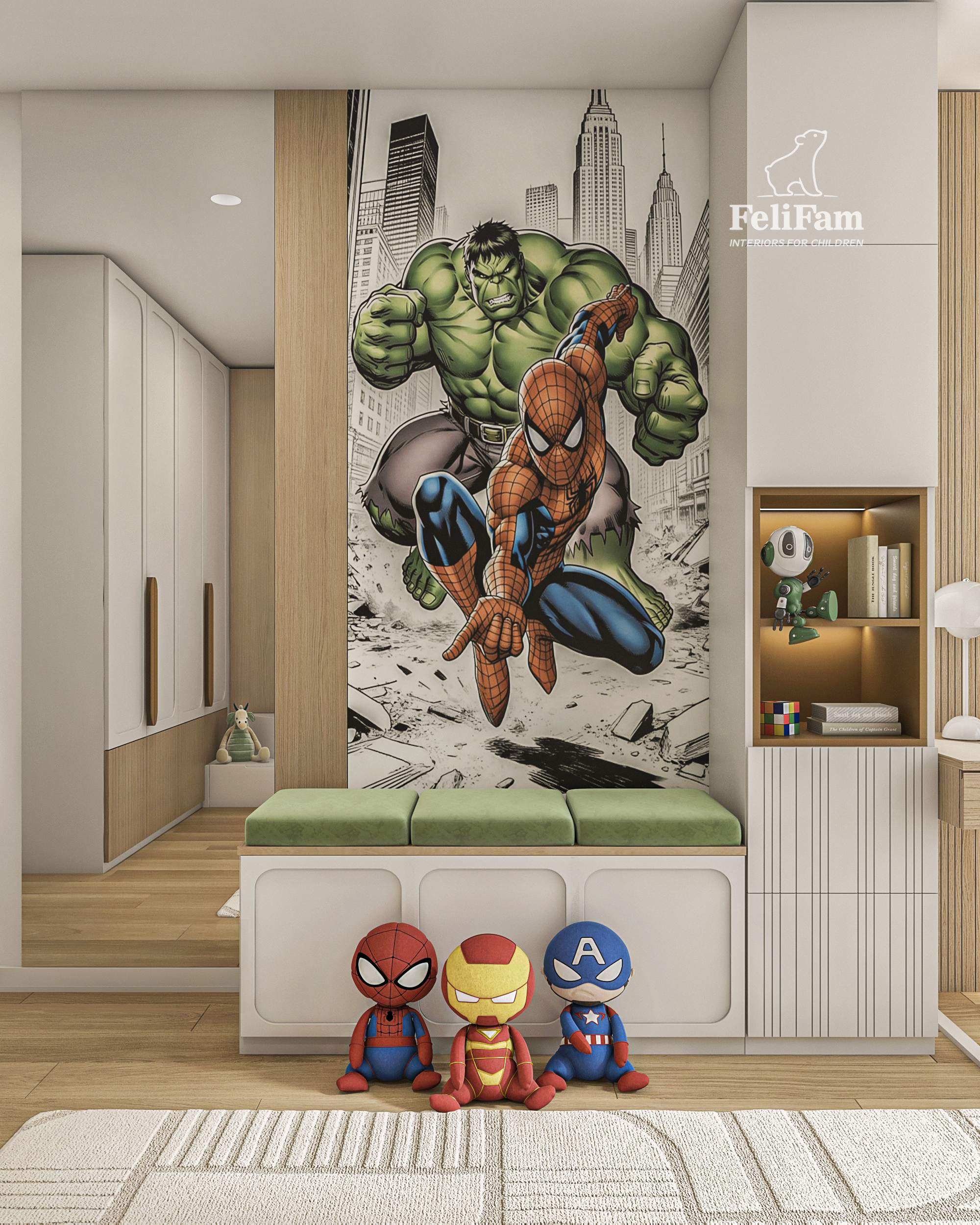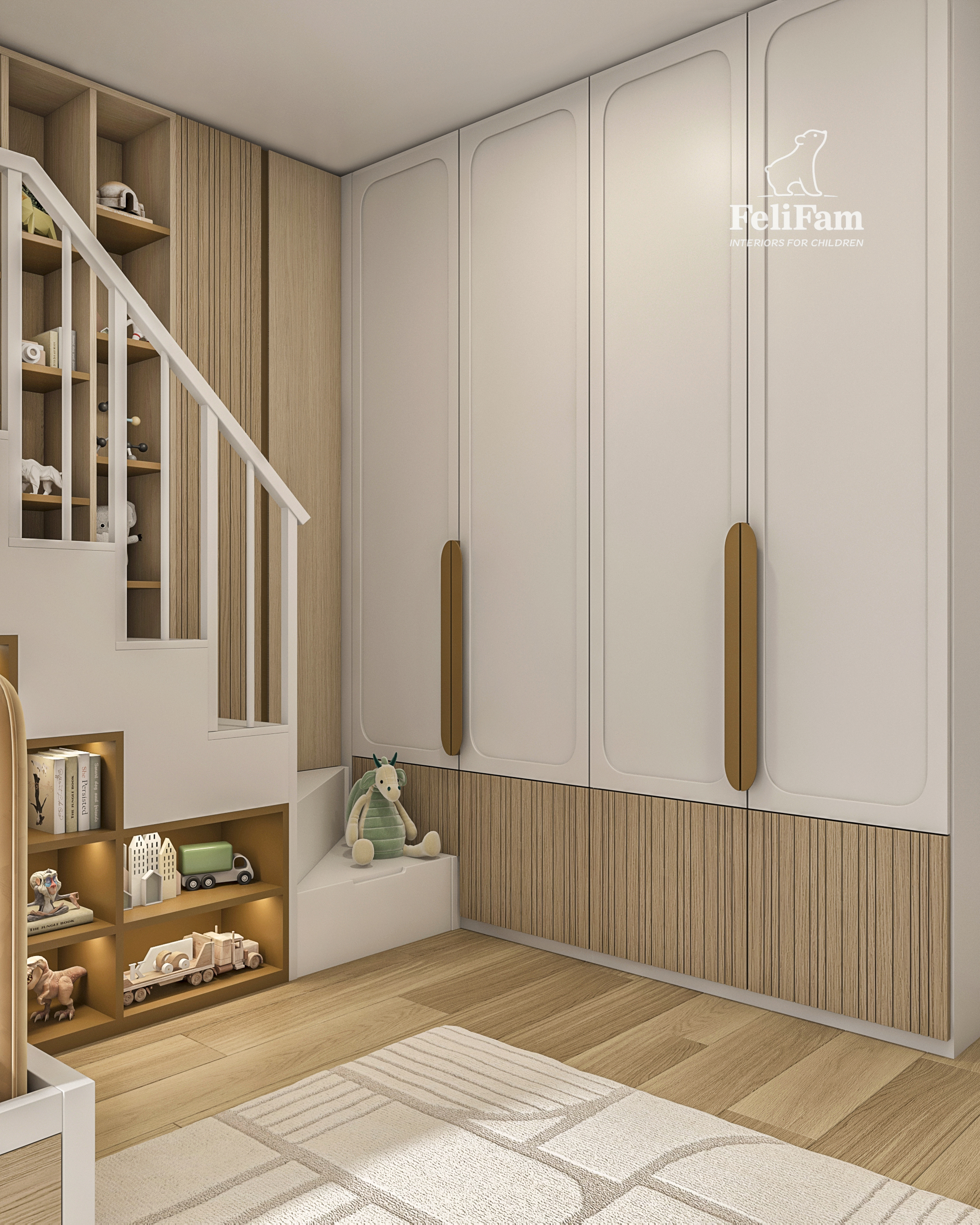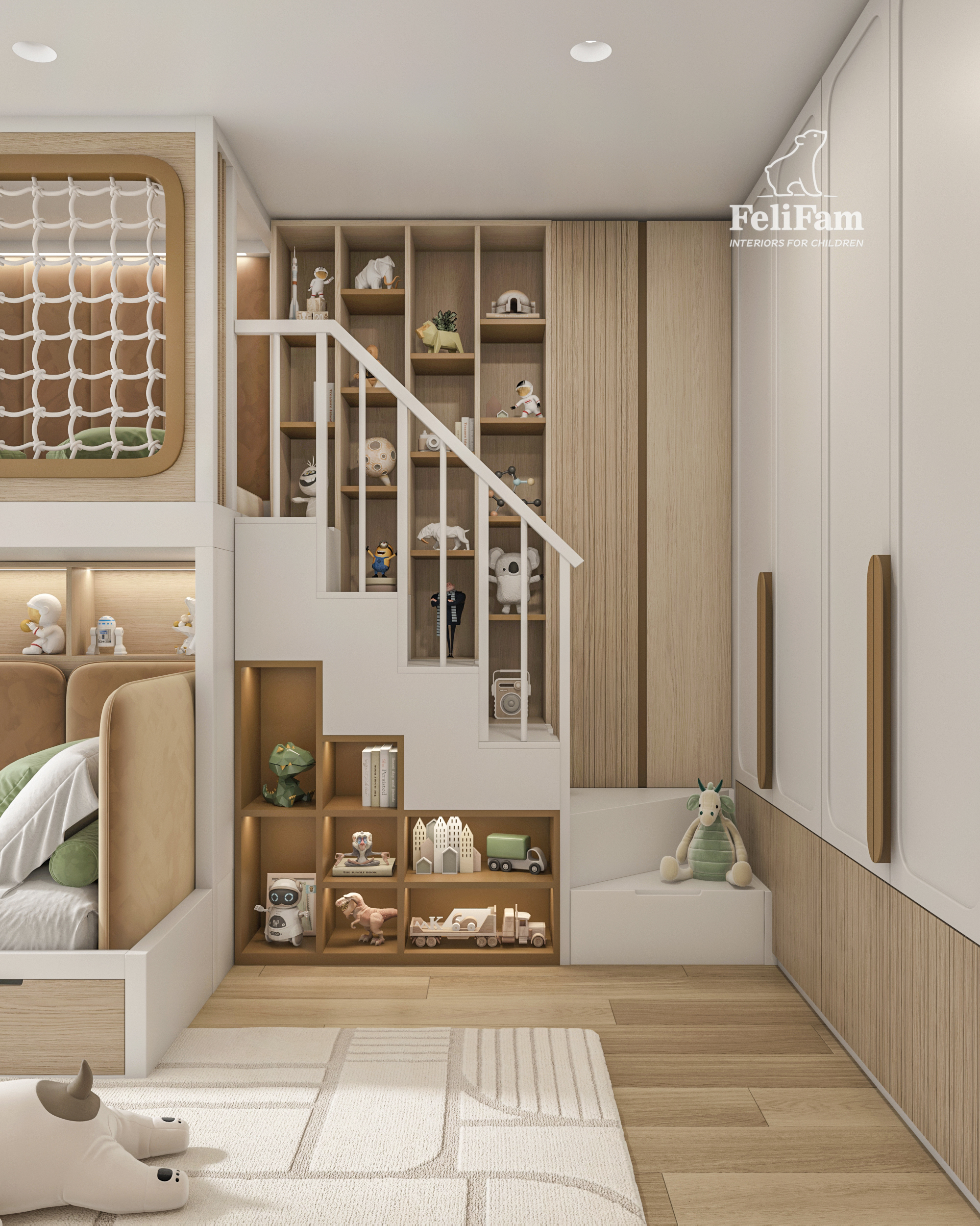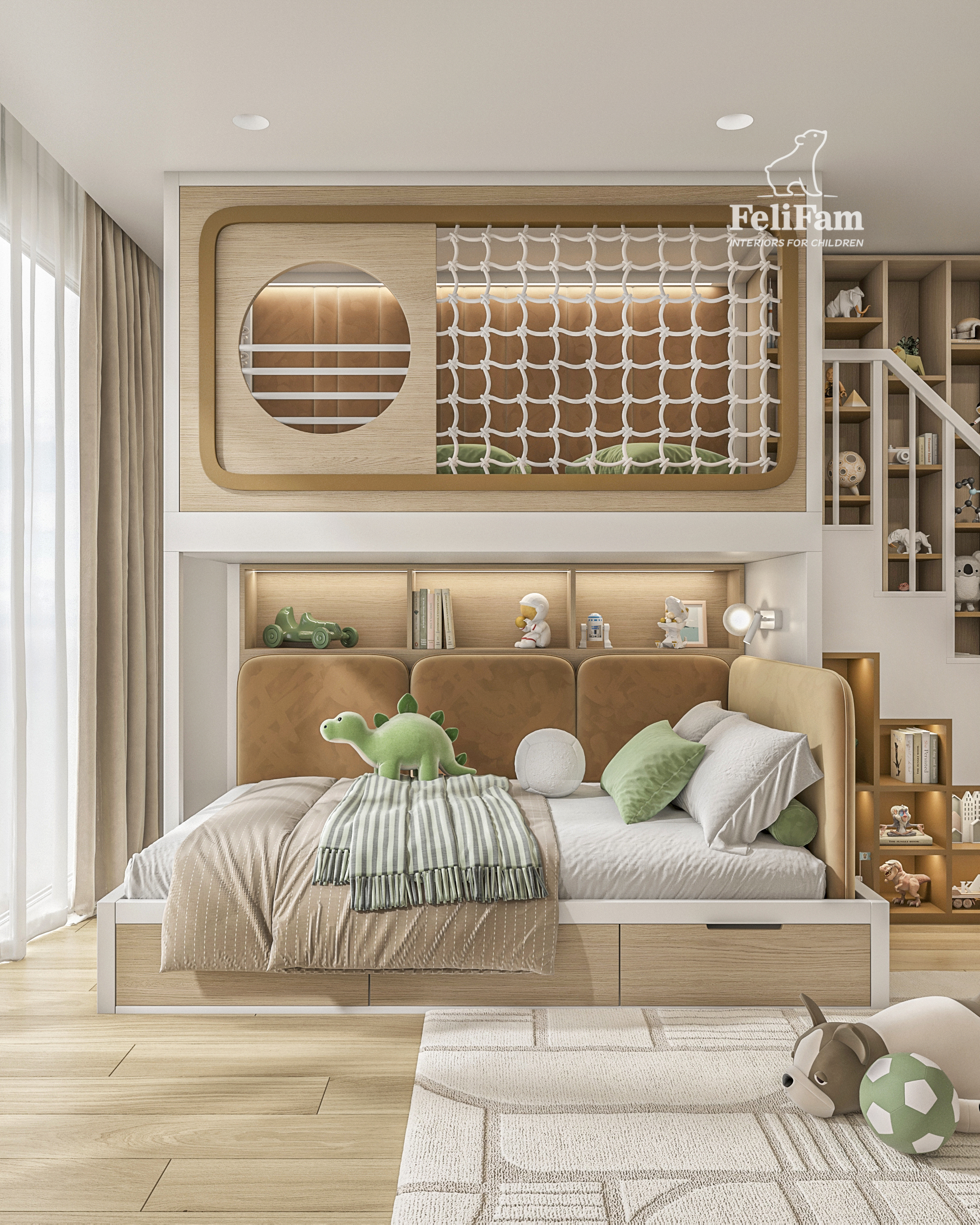 L’elemento principale è una struttura a più livelli con un letto a grandezza naturale, un’area giochi al secondo livello e scale con cassetti integrati. La stanza include anche un angolo studio, scaffali aperti e un dettaglio decorativo facilmente aggiornabile nel tempo.