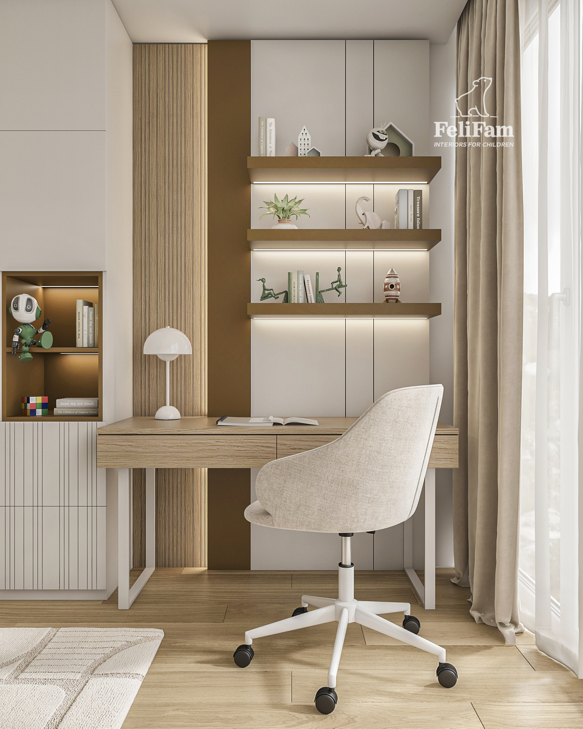 Camera per ragazzi moderna progettata come uno spazio funzionale che si adatta facilmente alle esigenze del bambino a diverse età. L’interno è realizzato in uno stile scandinavo sobrio, con texture naturali, tonalità morbide e soluzioni di archiviazione ben studiate.