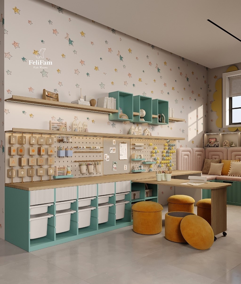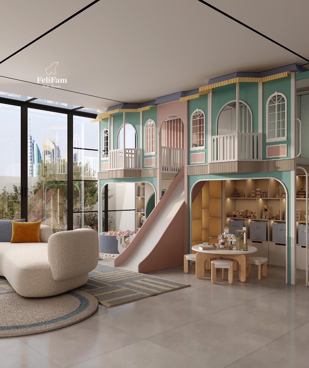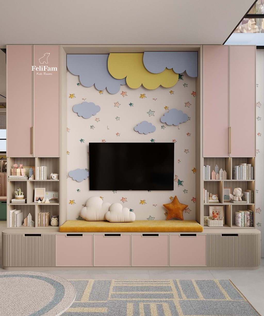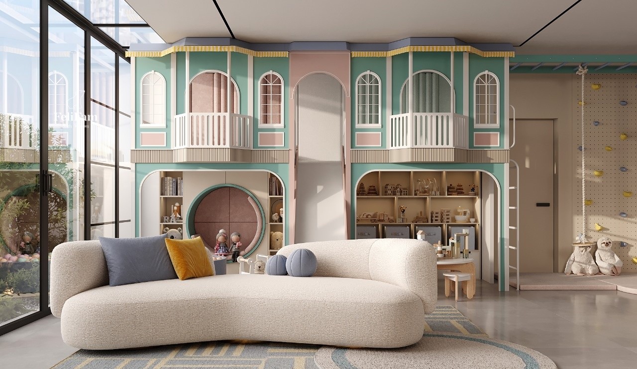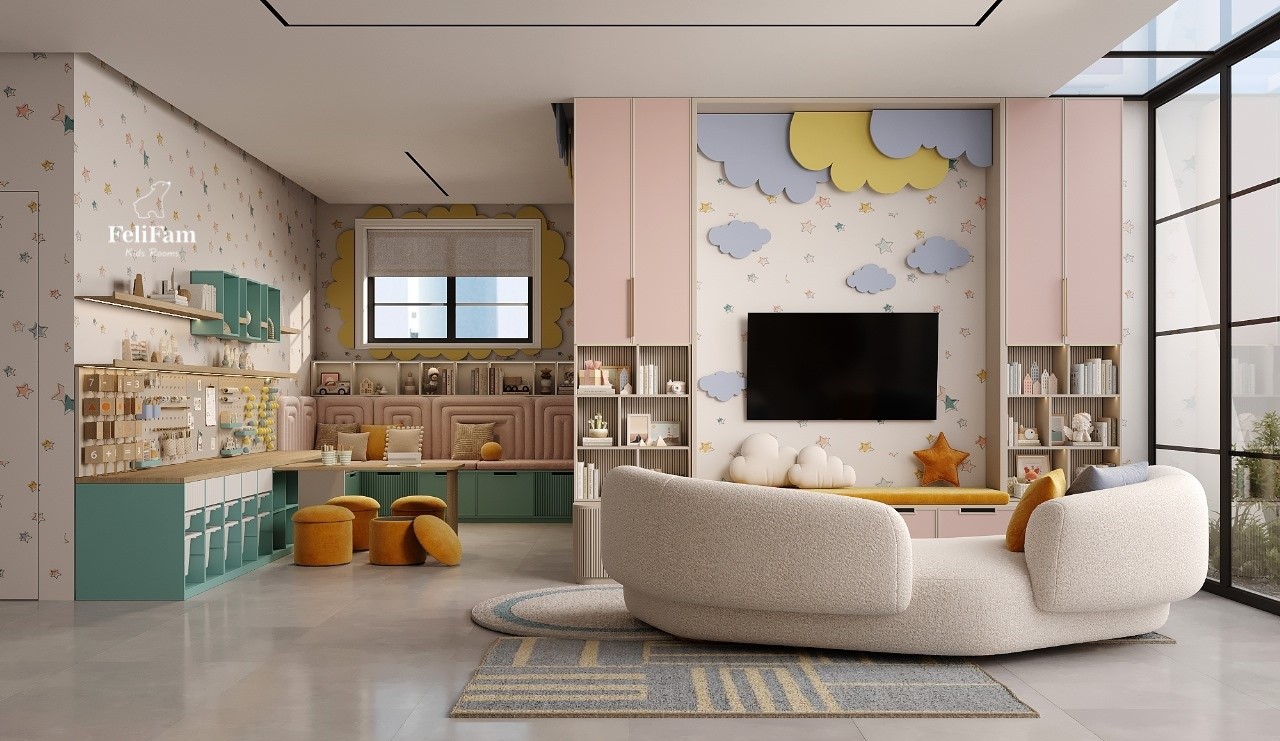 La stanza è arredata in stile moderno con dettagli vivaci che stimolano l’immaginazione senza appesantire lo spazio. Un comodo divano davanti alla TV crea un angolo per il relax e le attività tranquille, mentre le tecnologie moderne sono integrate in modo da affascinare e stimolare lo sviluppo.