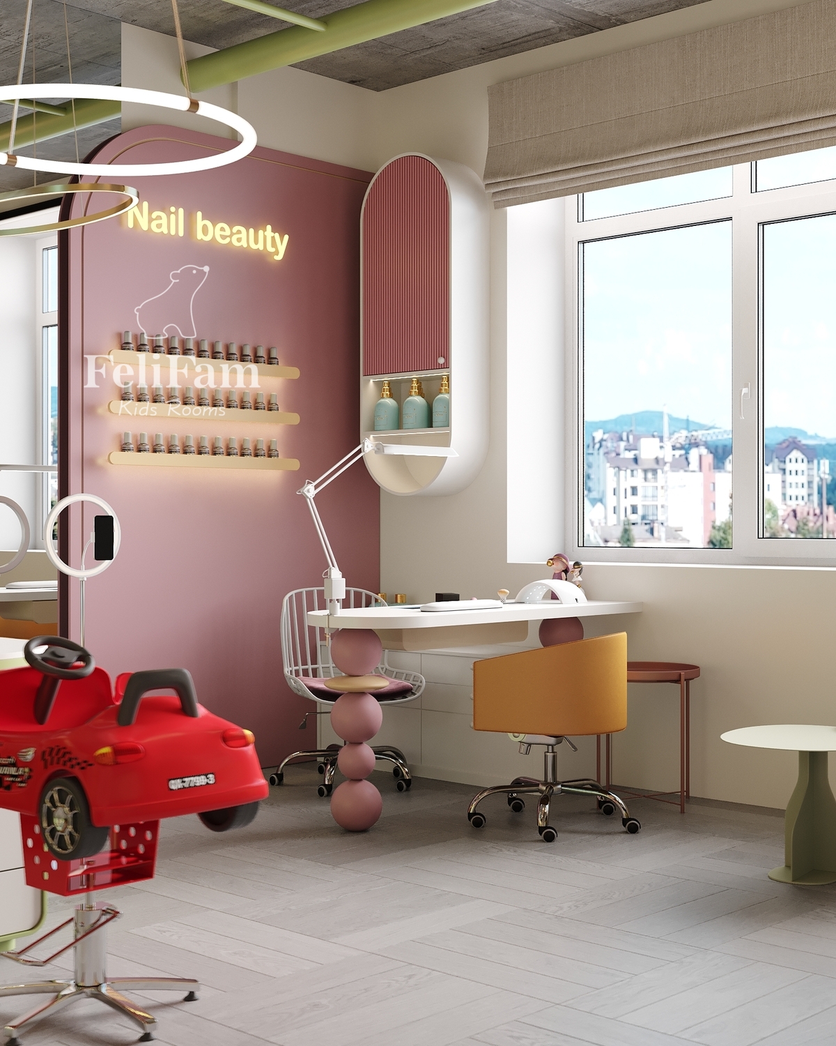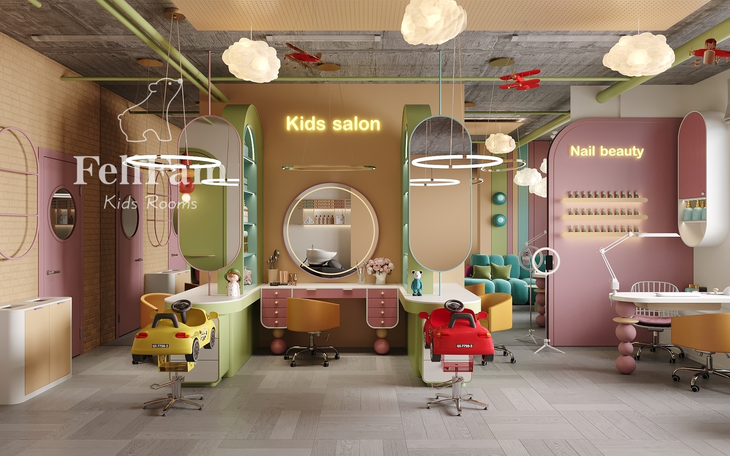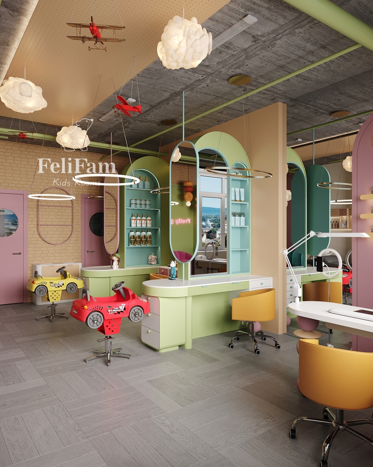 Questo progetto di design è stato realizzato per un salone di bellezza per bambini, dove i piccoli clienti si sentono speciali e i genitori si sentono a proprio agio e tranquilli.