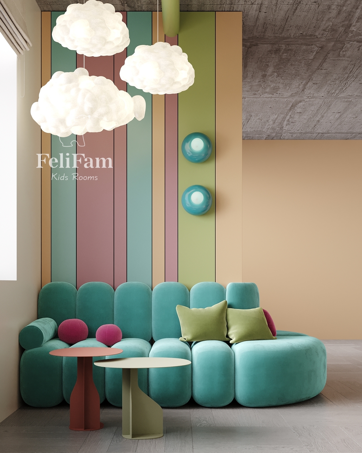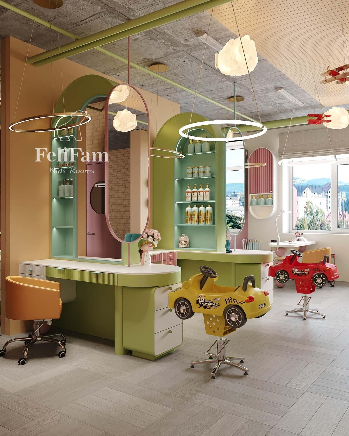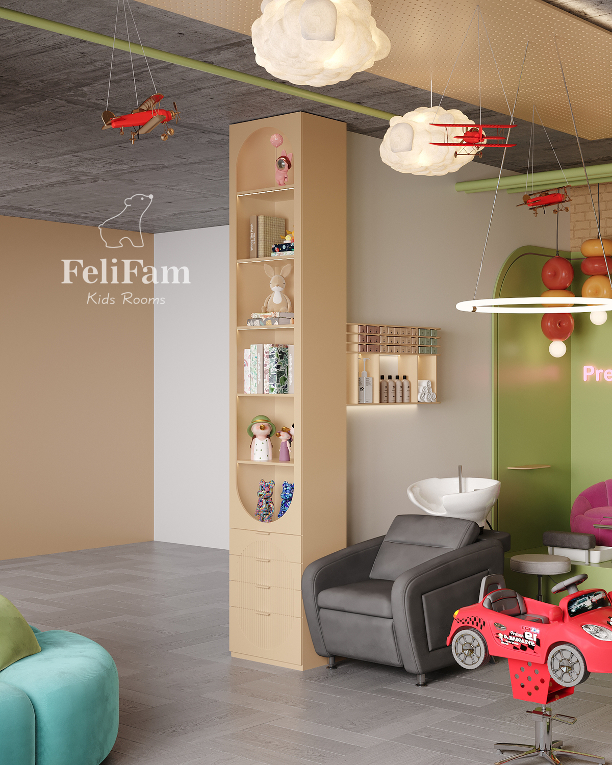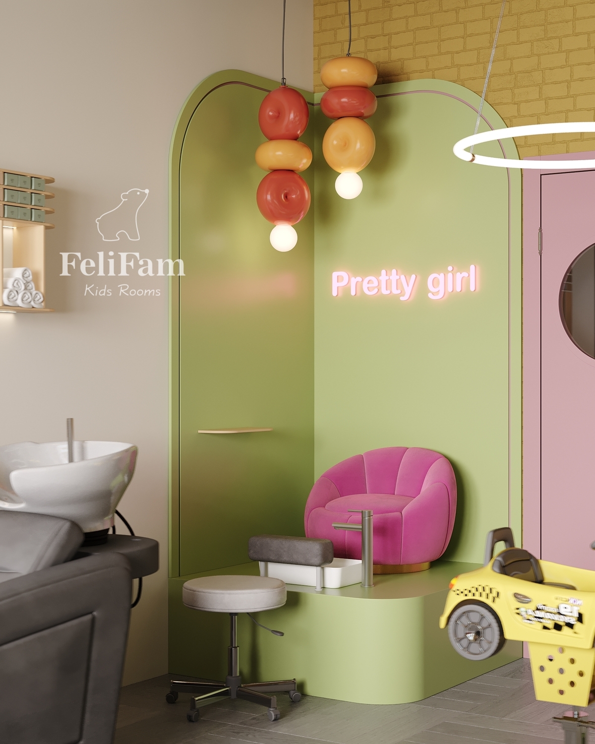 Questo progetto di design è stato realizzato per un salone di bellezza per bambini, dove i piccoli clienti si sentono speciali e i genitori si sentono a proprio agio e tranquilli.