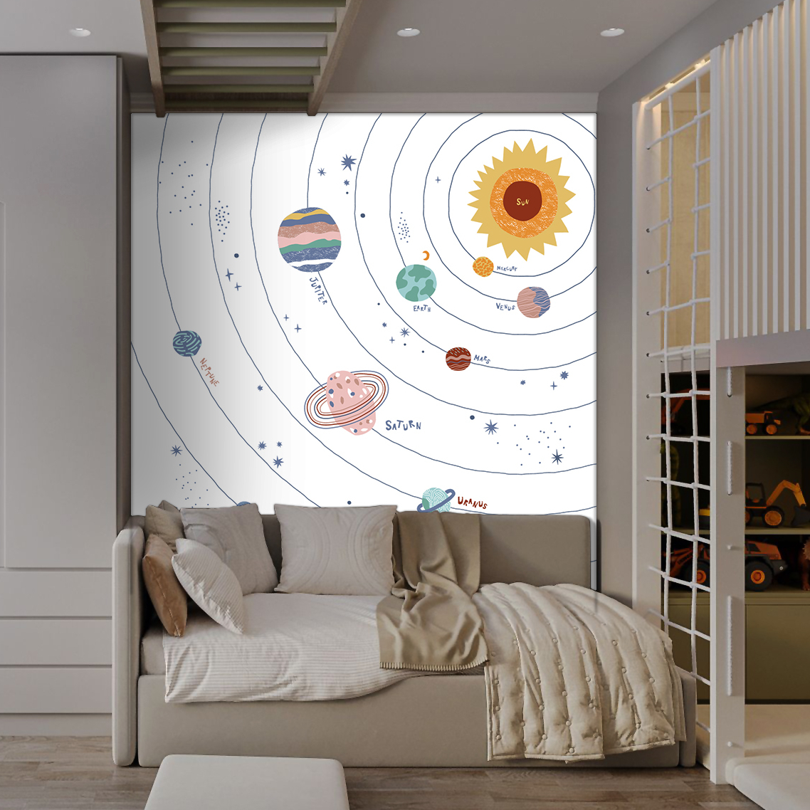 La carta da parati “Sistema solare” di Jolly Wall offre un’opportunità unica per i bambini di esplorare e imparare sul sistema solare. Con colori vivaci e un design realistico, crea un’atmosfera educativa e avventurosa nella loro stanza.