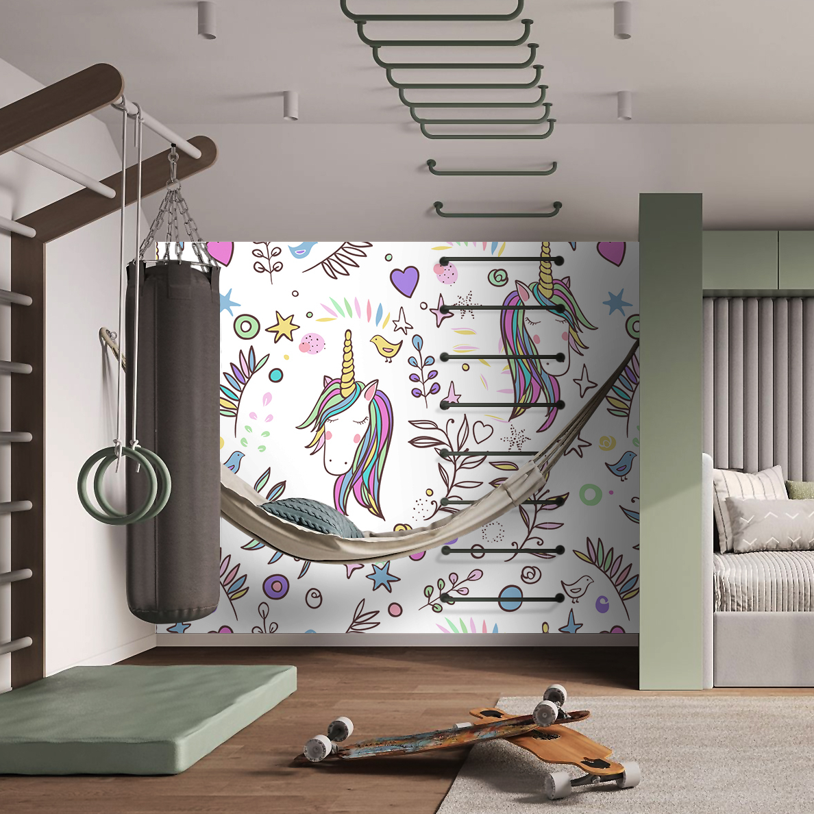 La carta da parati Unicorn Pattern di Jolly Wall trasformerà la stanza di un bambino in un mondo magico. Realizzata in vinile di alta qualità su materiale non tessuto, offre un’installazione facile e sicura, garantendo un ambiente sicuro ed ecologico.